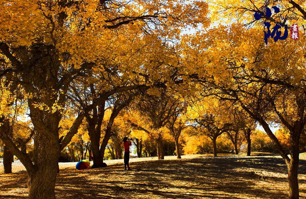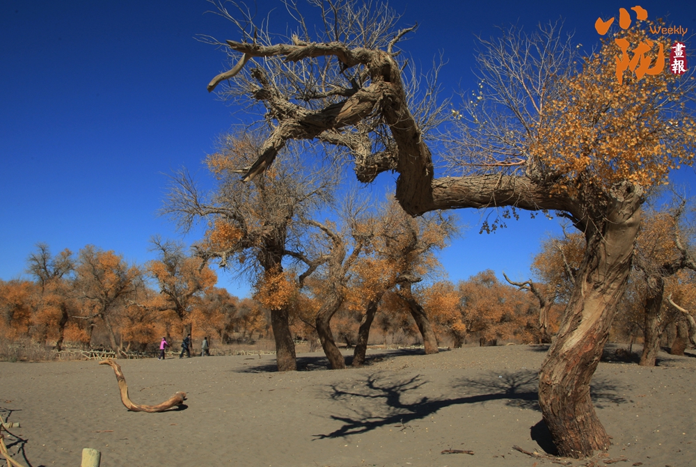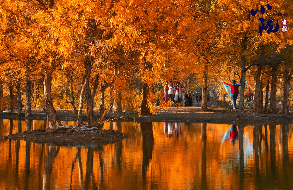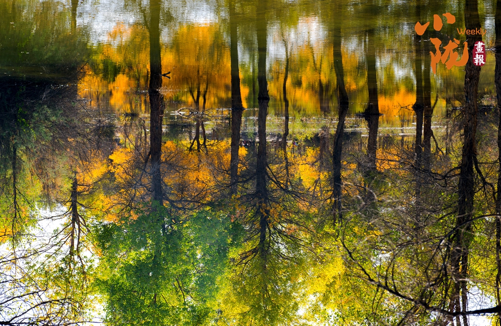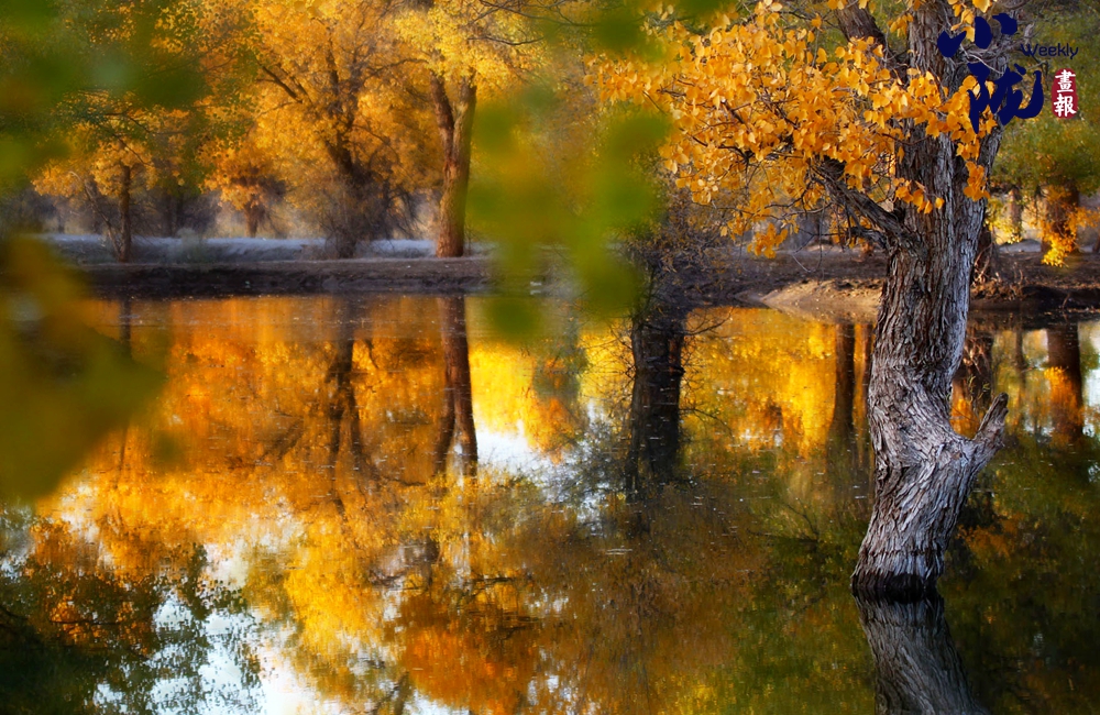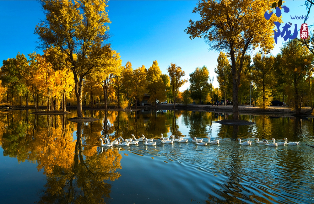 金色的(de)胡楊倒(dao)映在蔚(yu)藍的(de)水中,白鵝嬉戲,構成了一幅幅色彩對比(bi)強(qiang)(qiang)烈、視(shi)覺沖擊力極強(qiang)(qiang)的(de)絕美畫面。