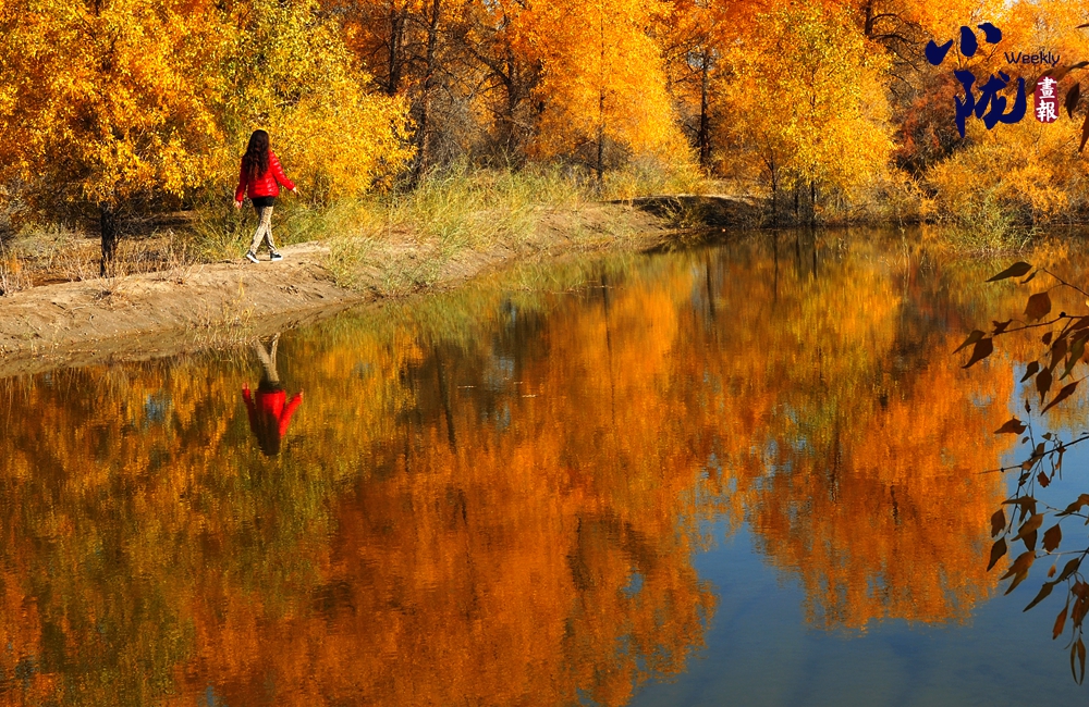 金黃色(se)(se)的胡(hu)楊懷抱著湖泊(bo),而湖泊(bo)水面倒映著金黃色(se)(se)的胡(hu)楊,像一(yi)幅色(se)(se)彩(cai)斑斕的油畫。