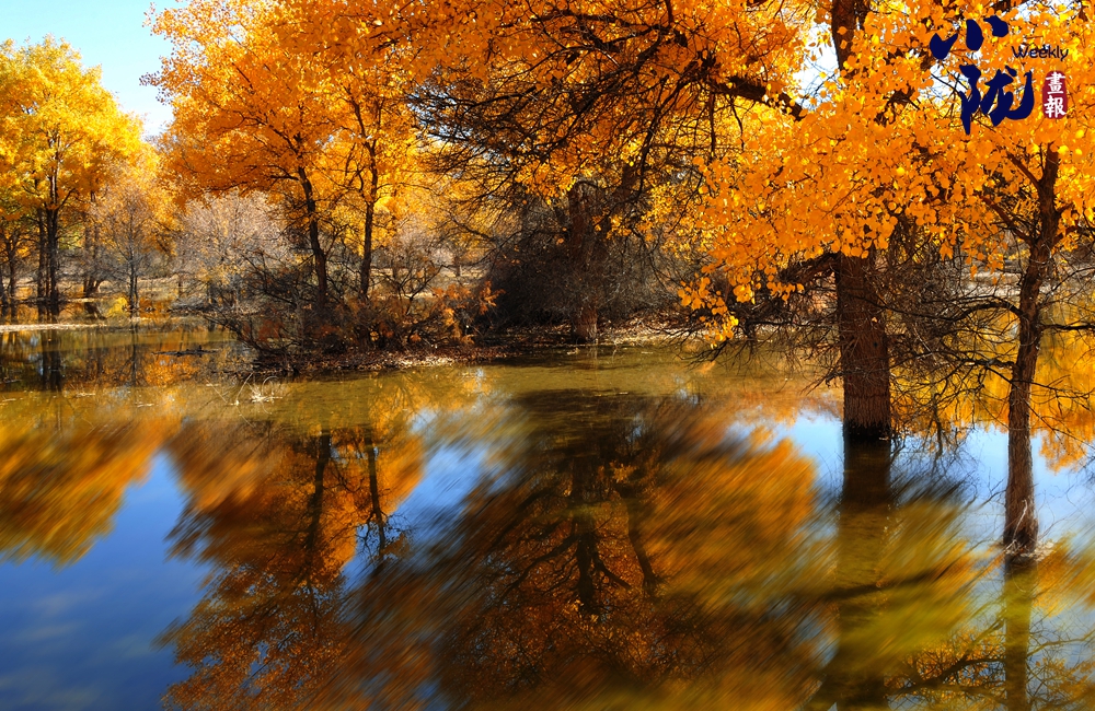 那(nei)清澈(che)的(de)金波湖面倒映(ying)著胡楊高(gao)大的(de)身影,多姿(zi)的(de)樹干,黃色(se)的(de)樹葉,都毫不保留地在水中展示(shi)出來。