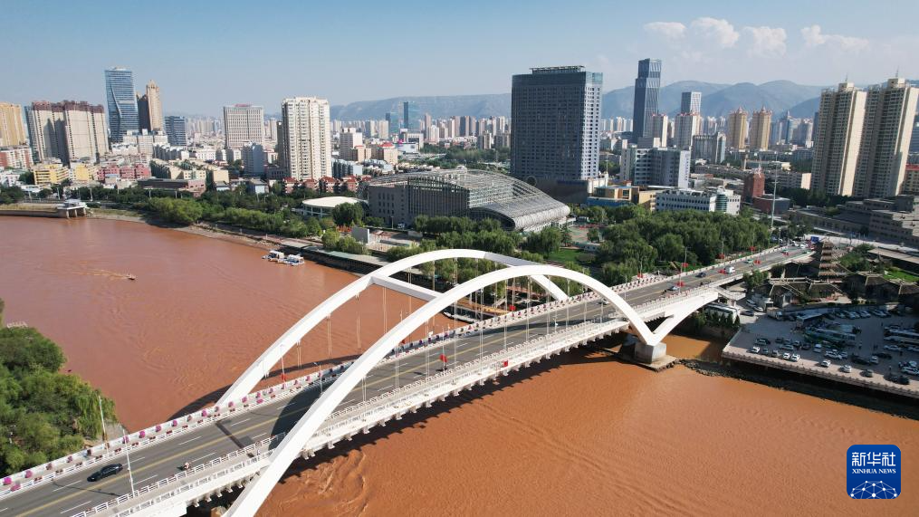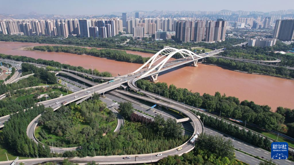 這是黃(huang)河蘭州段(duan)的雁灘黃(huang)河大橋(9月24日攝,無人機照片)。新華(hua)社(she)記者(zhe)陳斌(bin)攝