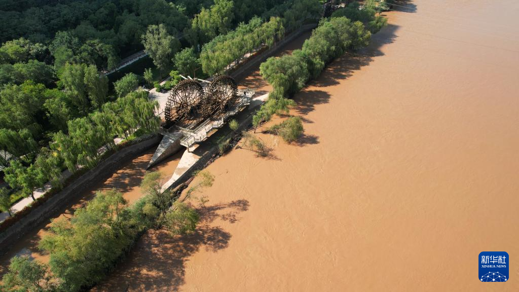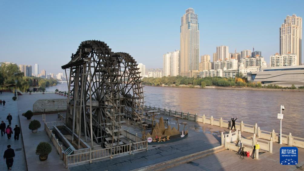 這(zhe)是黃(huang)河蘭州段(duan)南(nan)岸(an)的水車(10月17日攝(she),無人機(ji)照片(pian))。新華社記(ji)者陳斌攝(she)