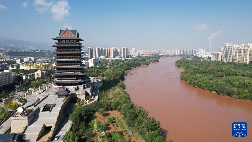 這是(shi)位于黃河蘭州(zhou)段(duan)南岸的黃河樓(9月(yue)26日(ri)攝,無(wu)人(ren)機照片)。新華(hua)社記者(zhe)陳斌攝