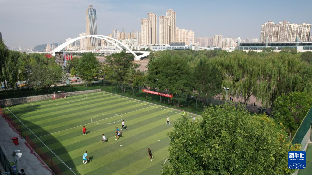 市民在位于黃河蘭州(zhou)段南岸的體育公園(yuan)足球場內踢球(9月24日攝(she),無人機照片)。新華社記者陳斌攝(she)