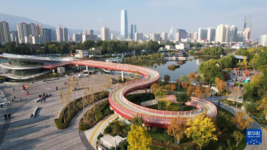 這是(shi)位于蘭州市城關區黃河(he)北岸(an)的馬拉松公園(10月17日攝,無(wu)人(ren)機照片)。新華社記者陳(chen)斌攝
