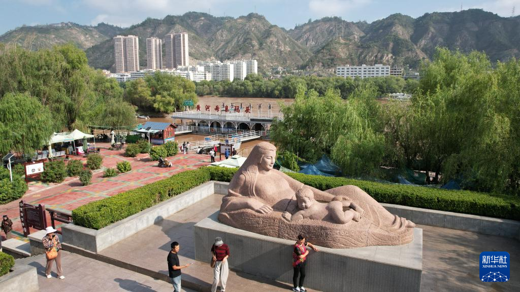 游客在位于黃河(he)蘭州(zhou)段南岸的黃河(he)母親雕像參觀游覽(9月25日攝,無人機照片)。新華社記者陳斌攝