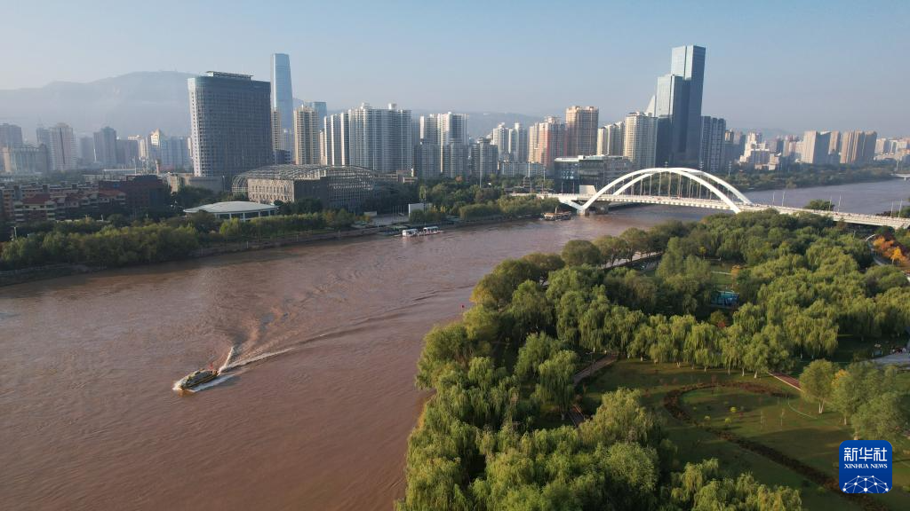 一艘水上巴(ba)士從黃河蘭州段航道上駛過(guo)(10月17日攝,無(wu)人機照(zhao)片)。新華社記者陳斌(bin)攝
