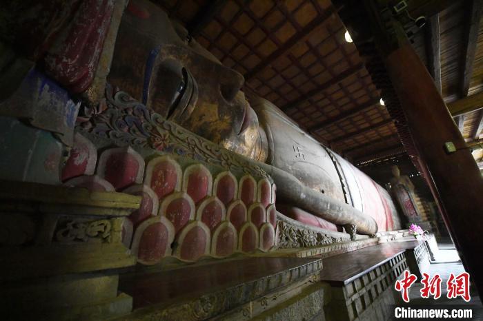 資料圖:圖為(wei)“西夏國(guo)寺”張(zhang)掖大佛(fo)(fo)寺大佛(fo)(fo)殿(dian)內(nei)的木胎(tai)泥塑臥佛(fo)(fo)。楊艷敏攝