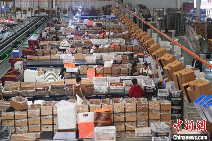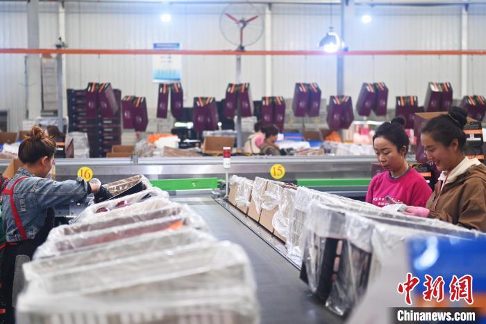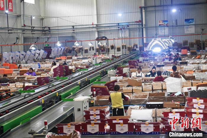 10月21日(ri),在(zai)甘肅省天水市秦安縣雪(xue)原果品有限公司加工(gong)車(che)間,蘋果自動化分揀(jian)線上工(gong)作人員進行分揀(jian)工(gong)作。中新社(she)記者李(li)亞龍(long)攝(she)