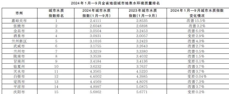 省生態環境廳發布2024年1月—9月全省14個地級城市及蘭州新區地表水環境質量排名情況