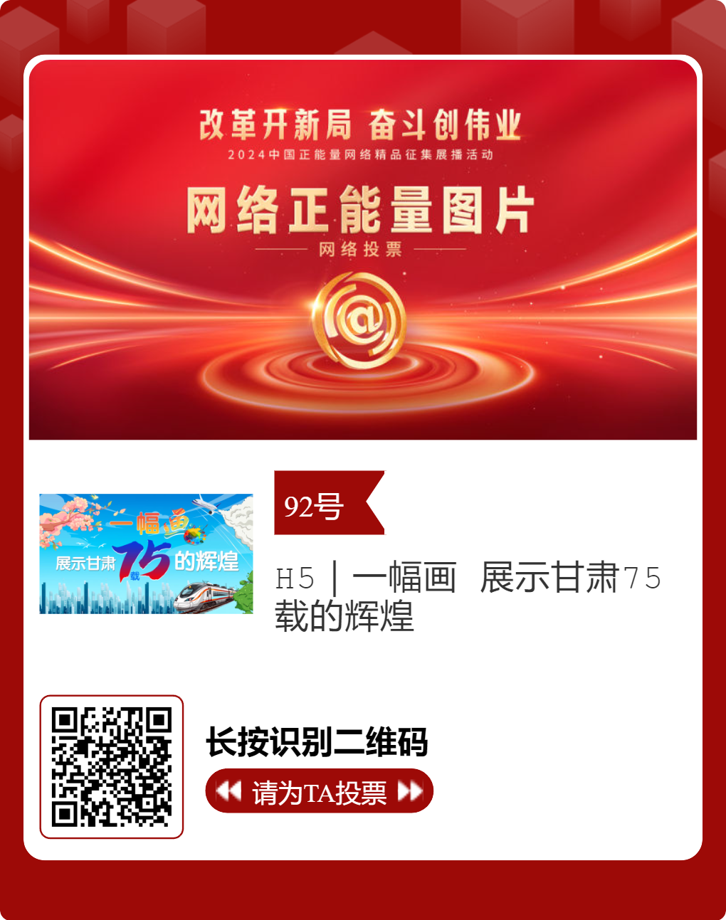 經過初選,由甘(gan)肅省委(wei)網信辦和(he)白銀市委(wei)網信辦選送(song)的(de)3件作(zuo)品脫穎(ying)而(er)出,進入終選。在此,誠邀每個充滿正能(neng)量的(de)你,為(wei)優(you)秀作(zuo)品投票(piao)點贊(zan),為(wei)甘(gan)肅正能(neng)量發聲。