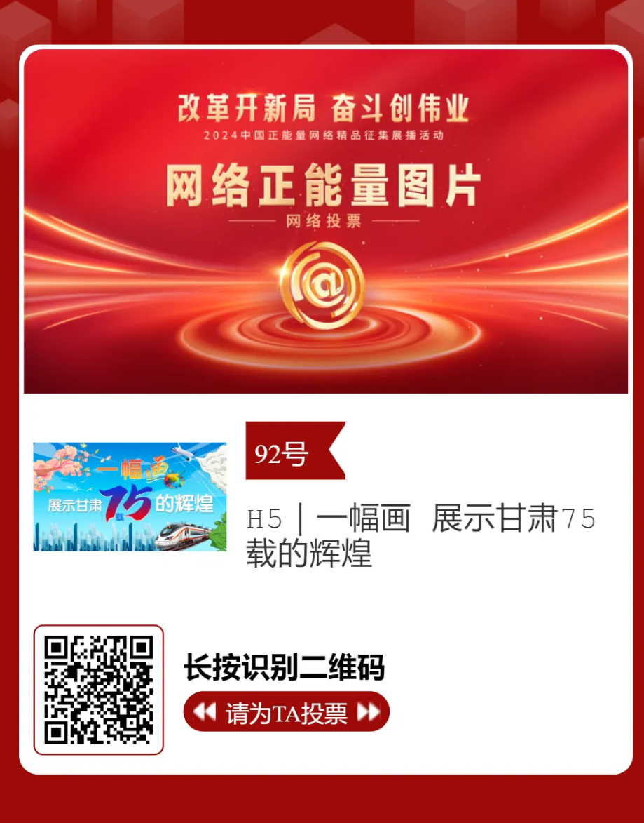 經(jing)過(guo)初選(xuan),由甘(gan)肅省委(wei)(wei)網(wang)信辦(ban)和慶陽市委(wei)(wei)網(wang)信辦(ban)選(xuan)送的7件作品(pin)脫穎而(er)出,進入終選(xuan)。在此,誠邀每個充(chong)滿正(zheng)能量的你,為優秀(xiu)作品(pin)投票點贊,為甘(gan)肅正(zheng)能量發聲。