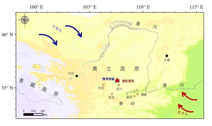 南佐遺址和(he)帥堡(bao)剖面地理(li)位置及所受季風(feng)影響示意(yi)圖。韓建業 供圖