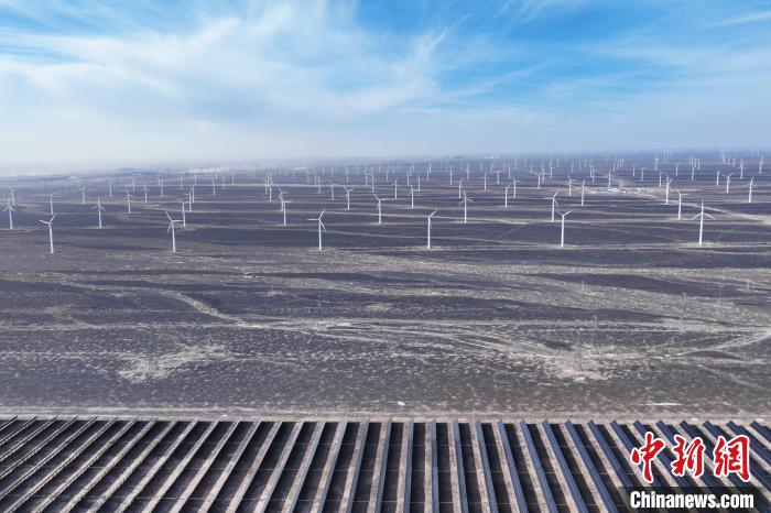 1月6日,航拍甘(gan)肅省酒泉市(shi)瓜州縣光伏和風力發電(dian)項(xiang)目。李亞龍(long) 攝