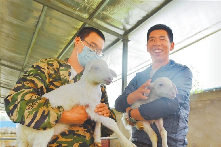 張忠山(右)和同(tong)事(shi)查看羊羔(gao)的(de)生(sheng)長情況(kuang)。