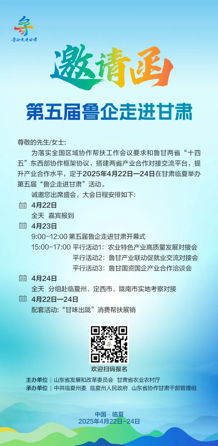 為落(luo)實4月1日召開的(de)全國區(qu)域協作(zuo)幫(bang)扶(fu)工作(zuo)會議(yi)要求(qiu)和魯甘兩省“十四五”東西(xi)部協作(zuo)框架(jia)協議(yi),搭建(jian)兩省產(chan)業合(he)作(zuo)對接交流平臺,提(ti)升產(chan)業合(he)作(zuo)水平,第(di)五屆魯企(qi)走進甘肅(su)活動定于4月22日—24日在臨夏(xia)舉辦,歡迎各位企(qi)業家報(bao)名參會!