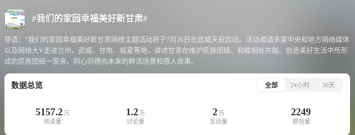 為(wei)深化(hua)互(hu)動引(yin)導,打造高(gao)流量IP,@甘(gan)(gan)(gan)肅(su)(su)(su)(su)(su)網信(xin)、@快看甘(gan)(gan)(gan)肅(su)(su)(su)(su)(su)等官(guan)方賬號發(fa)起(qi)社交平臺互(hu)動話(hua)題#我們的家園幸福美好新甘(gan)(gan)(gan)肅(su)(su)(su)(su)(su)#。結合#厚道甘(gan)(gan)(gan)肅(su)(su)(su)(su)(su)##萬(wan)千氣象看甘(gan)(gan)(gan)肅(su)(su)(su)(su)(su)#等話(hua)題,@中新觀隴、@中國甘(gan)(gan)(gan)肅(su)(su)(su)(su)(su)網、@甘(gan)(gan)(gan)肅(su)(su)(su)(su)(su)好網民、@蘭州新區發(fa)布、@甘(gan)(gan)(gan)南融媒等賬號同(tong)步發(fa)力、同(tong)頻(pin)共振(zhen)。目(mu)前,該話(hua)題總(zong)閱(yue)讀量超5530萬(wan)人次,討論互(hu)動量3.2萬(wan)人次。