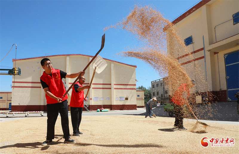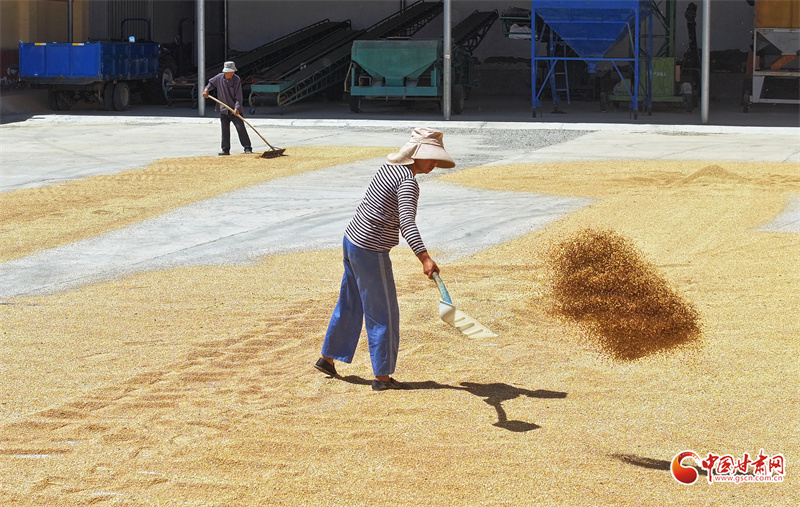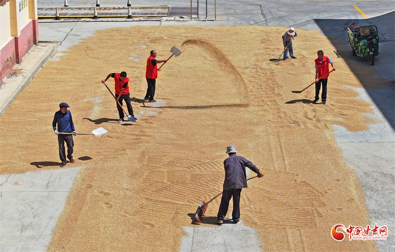 8月19日,在民樂(le)縣糧食產后服務中(zhong)心(xin)的曬場上,糧農們正在搶抓晴好天氣翻曬小(xiao)麥(mai)。