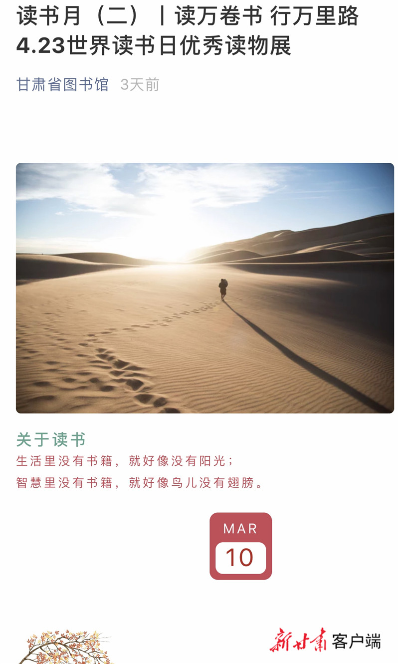 讓我們一起(qi)讀書(shu)吧!甘肅省圖書(shu)館推出(chu)線(xian)上讀書(shu)月系列活動