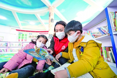 江蘇省海安高新區文化志愿者在農家書屋里與留守兒童一起閱讀兒童讀物。翟慧勇攝/光明圖片