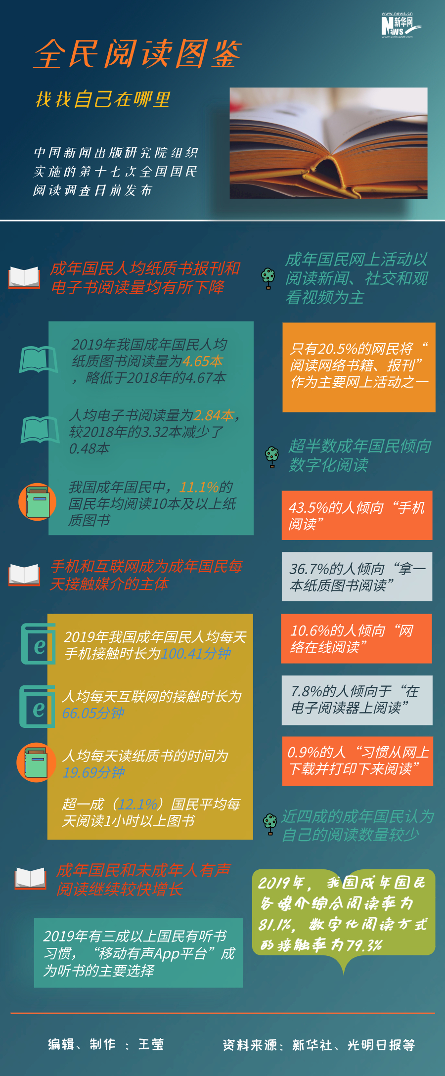 今天是(shi)世界讀書(shu)日(ri),中國(guo)新(xin)聞出版(ban)研(yan)究院日(ri)前(qian)公(gong)布第十(shi)七(qi)次全國(guo)國(guo)民閱讀調查(cha)結果。國(guo)民人均一年讀幾本書(shu)?用在(zai)閱讀上的時間有多少?隨著移動互聯趨勢的發展(zhan),在(zai)閱讀方(fang)式和閱讀習慣上有哪些改變(bian)?跟隨這份全民閱讀圖鑒(jian),找(zhao)找(zhao)自(zi)己在(zai)哪里(li)。