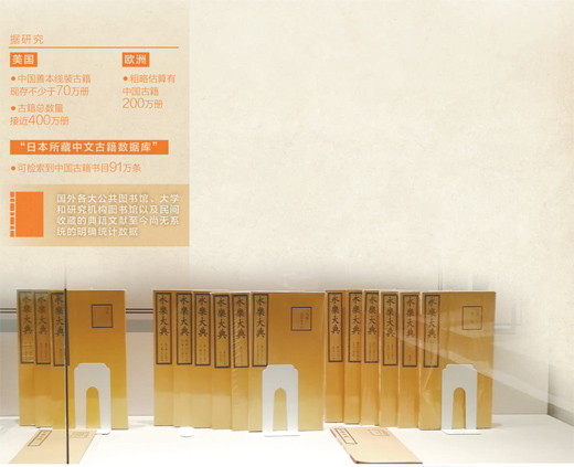 據聯合國教科文組織調查統計,目前在全球47個國家和地區的200多座博物館中,記錄在案的中國文物有167萬件,而流散在海外民間的約是此數目的10倍,這些文物中間包括大量的古代典籍文獻。據研究,美國現存中國善本線裝古籍不少于70萬冊,古籍總數量接近400萬冊;歐洲粗略估算古籍有200萬冊;流入日本的中國古籍更多,“日本所藏中文古籍數據庫”中便可檢索到91萬條漢籍書目。國外各大公共圖書館、大學和研究機構圖書館以及民間收藏的典籍文獻至今尚無系統的明確統計數據。