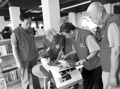 社(she)區退休(xiu)黨員在“紅旗書屋(wu)”里翻看大型圖(tu)冊《中國》。