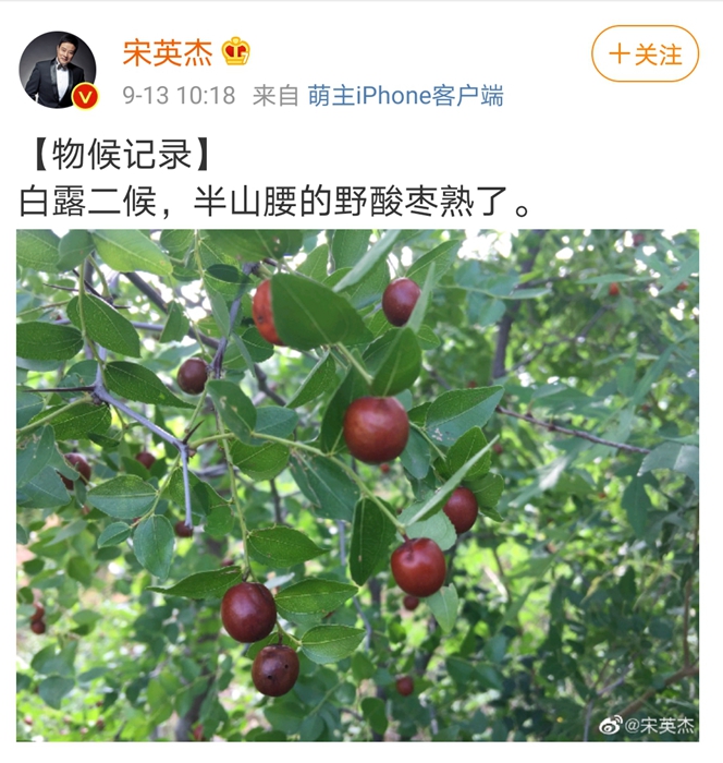 如今,他仍然(ran)會隨手(shou)在社交媒體上(shang)記(ji)錄四時(shi)風物的(de)變化,前(qian)幾(ji)天(tian)發了(le)一(yi)張照片,配文“白露二(er)候,半山腰的(de)野酸棗熟了(le)。”對(dui)他而言,隨時(shi)關注(zhu)氣候與物候,已經成為一(yi)種習(xi)慣。(完)