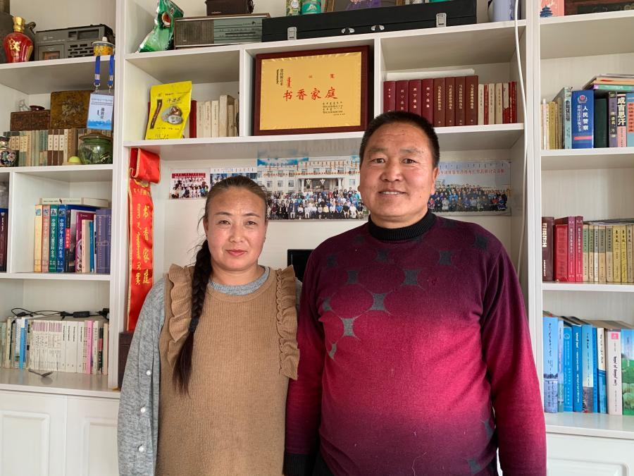 2020年12月10日,牧民敖特根達來和妻子在自家“書香家庭”獎牌前合影。新華社記者 朱文哲 攝