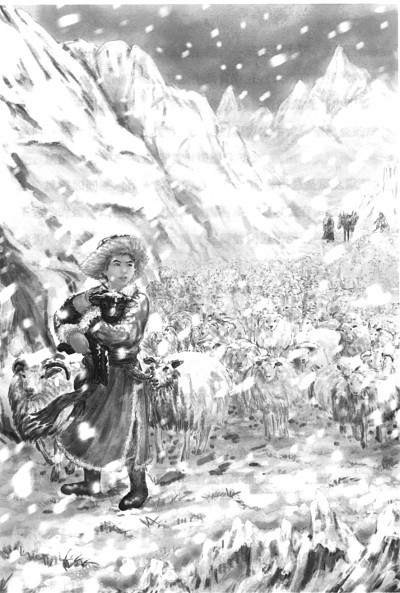 《金珠瑪米小(xiao)扎西》插(cha)圖(tu),小(xiao)扎西在山間(jian)牧(mu)羊。何毅畫