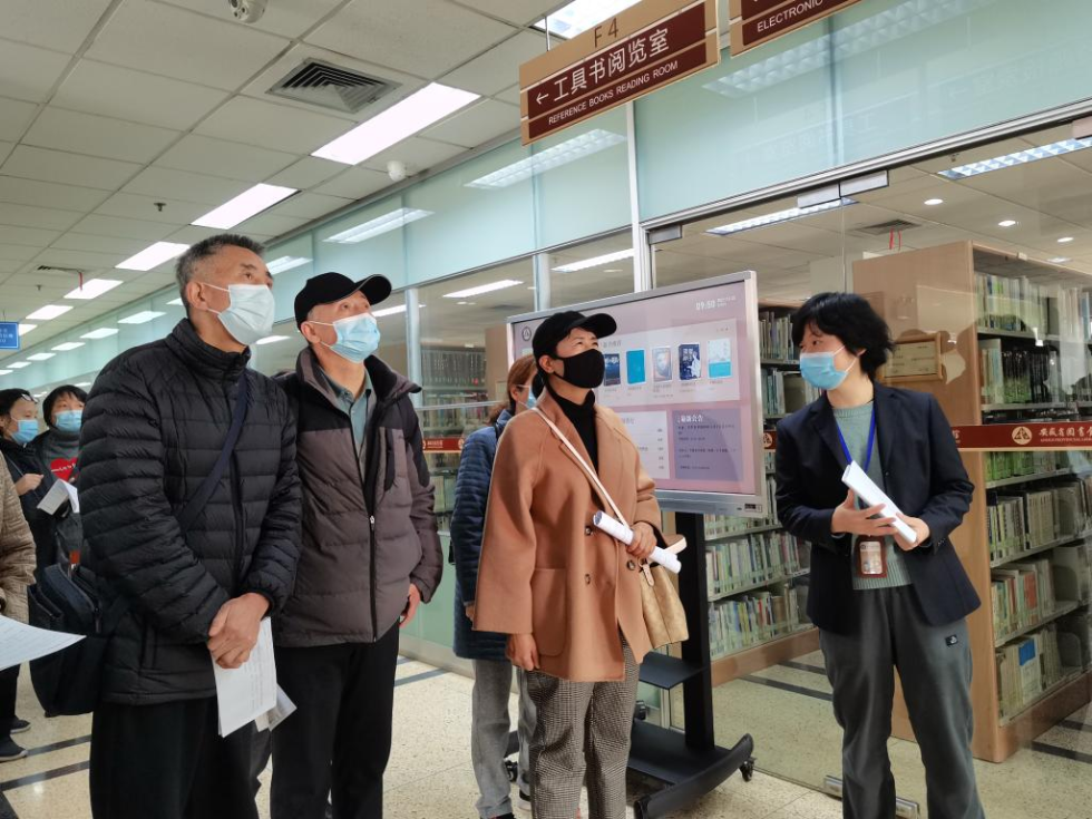 圖(tu)書館(guan)里的(de)志愿者老師帶領老人游覽(lan)圖(tu)書館(guan),并(bing)用英(ying)語進行講解。新華(hua)社記者汪(wang)海月攝