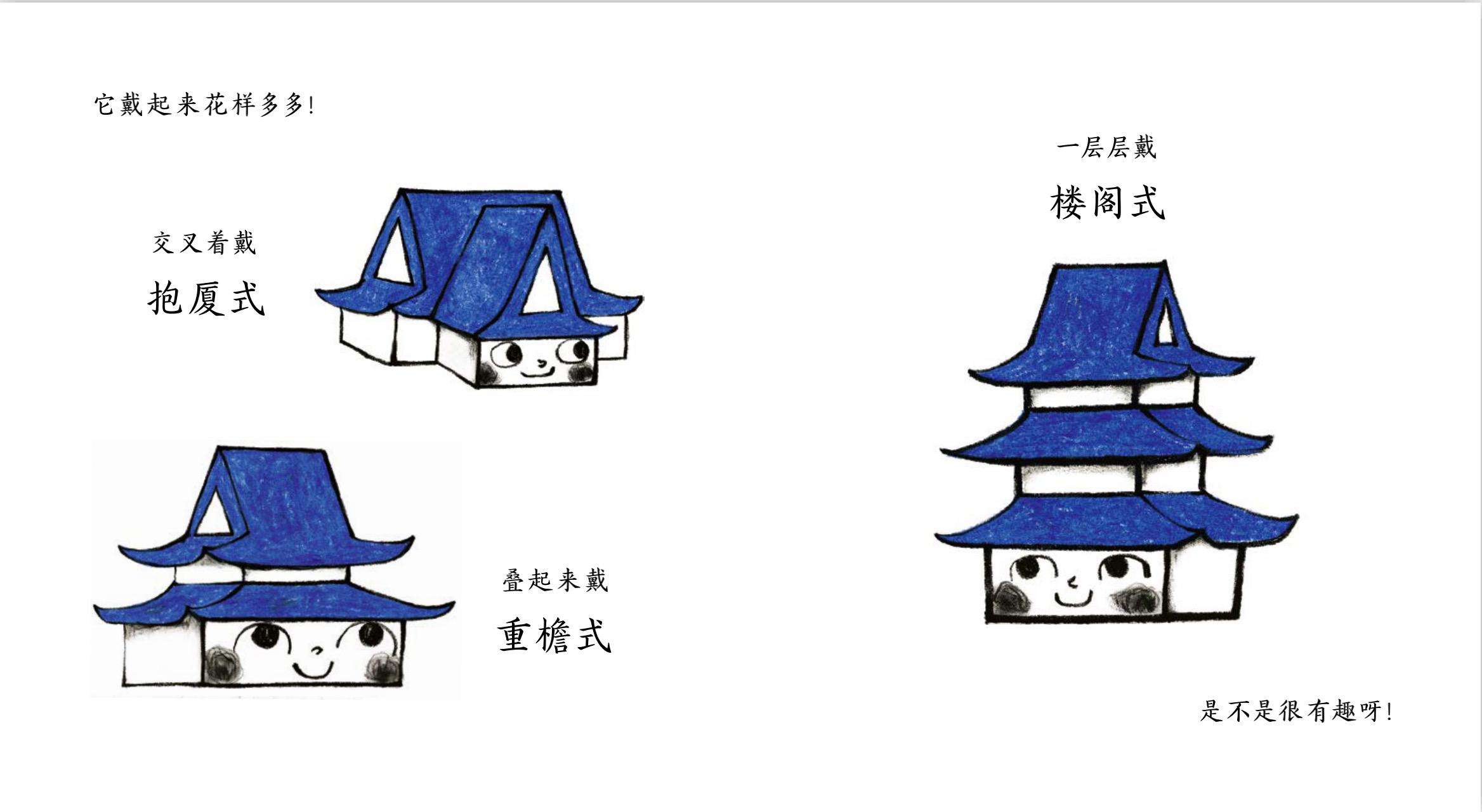 作者以真實的(de)傳統(tong)建(jian)筑為(wei)原型,選取屋(wu)頂、鴟吻、窗欞(ling)、斗拱、瓦當(dang)和柱礎這(zhe)六個頗有代(dai)表性的(de)傳統(tong)建(jian)筑構件,讓(rang)他們(men)自由(you)地演(yan)繹自己的(de)故事。比(bi)如,介紹屋(wu)頂時,想(xiang)象成“給房子戴帽(mao)(mao)子”,不(bu)同(tong)的(de)“帽(mao)(mao)子”有不(bu)同(tong)的(de)名字,還(huan)有不(bu)同(tong)的(de)戴法: