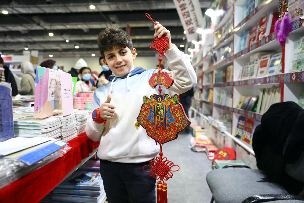 2月4日(ri),在埃及開(kai)羅舉辦的開(kai)羅國際書(shu)展上,一名男孩(hai)在中(zhong)國圖書(shu)展位展示春節裝飾。新華社發(艾哈邁德·戈馬攝)