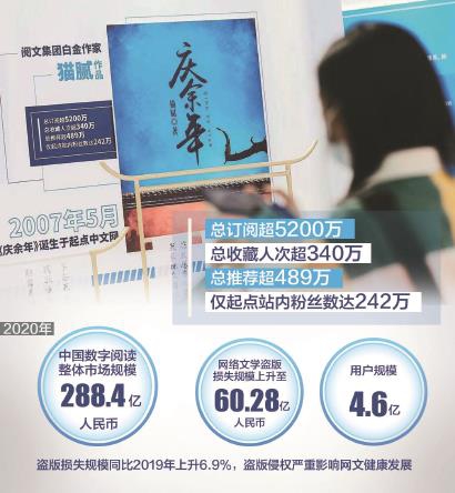 有數據顯示(shi),2020年中國網絡(luo)文(wen)(wen)學(xue)(xue)市場規模(mo)(mo)為288.4億(yi)元,網絡(luo)文(wen)(wen)學(xue)(xue)通過(guo)IP全版權運營間(jian)接(jie)或直(zhi)接(jie)影響了動漫、音樂(le)、影視、游(you)戲等(deng)合計約(yue)2531億(yi)元的市場,對(dui)數字(zi)文(wen)(wen)化產(chan)業(ye)的影響范圍超過(guo)40%。但令(ling)人痛心的是(shi),2020年中國網絡(luo)文(wen)(wen)學(xue)(xue)盜版損(sun)失規模(mo)(mo)達(da)60.28億(yi)元,同比上升6.9%。