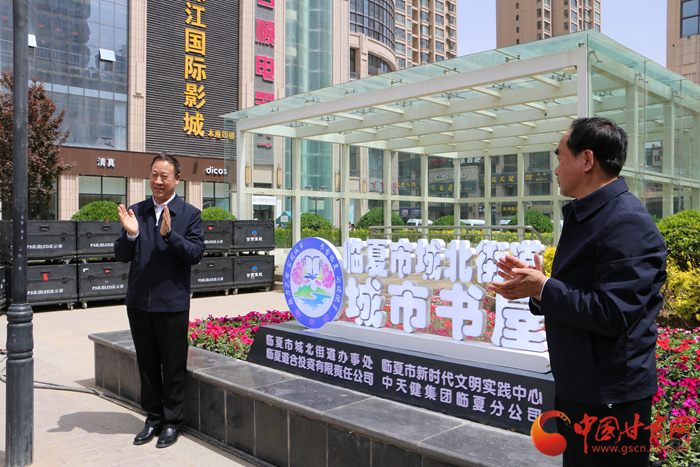 甘肅省委宣傳部副部長、省新聞出版(ban)局(ju)(版(ban)權局(ju))局(ju)長王成勇(yong)(左(zuo))為臨夏市(shi)城(cheng)北街道城(cheng)市(shi)書屋揭(jie)牌