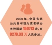 數據顯示,全國各(ge)級公(gong)共(gong)圖書館普(pu)遍開展(zhan)講座、展(zhan)覽、閱讀(du)指導、讀(du)書交流(liu)、演講誦(song)讀(du)等活動(dong)。僅2020年,各(ge)地(di)公(gong)共(gong)圖書館就為讀(du)者舉辦各(ge)種活動(dong)150713次,有(you)9279.33萬人次參(can)加。