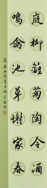 庭柳籬菊(ju)(ju)陶令酒(jiu),鳴(ming)禽池草(cao)謝家春。 釋文:庭前柳樹,籬邊(bian)菊(ju)(ju)花,陶淵明飲酒(jiu)于(yu)此(ci),怡然(ran)自得;池塘里長滿(man)了(le)春草(cao),樹上的鳴(ming)鳥冬去春來,謝靈運因此(ci)寫出(chu)了(le)這樣(yang)的千載名句。韓(han)宗岳(滿(man)族)