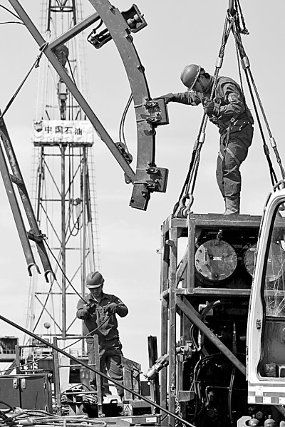 在位于克拉瑪依的新疆油田公司百口泉采油廠瑪湖第一采油作業區,石油工人正在進行測試作業。閔勇攝/光明圖片