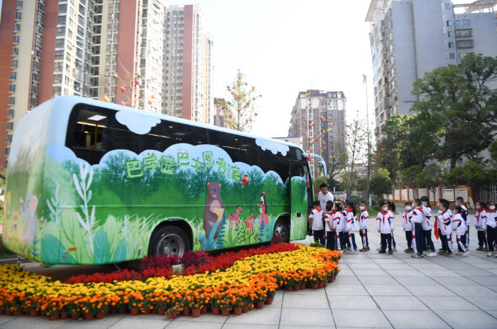 11月10日,長沙市青園友誼小(xiao)學的學生(sheng)排隊進入巴(ba)士圖(tu)書館。