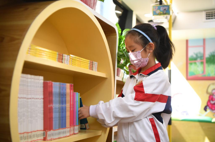 11月10日,學生(sheng)在長沙市(shi)青(qing)園友(you)誼(yi)小學巴士圖(tu)書(shu)館內歸(gui)還圖(tu)書(shu)。