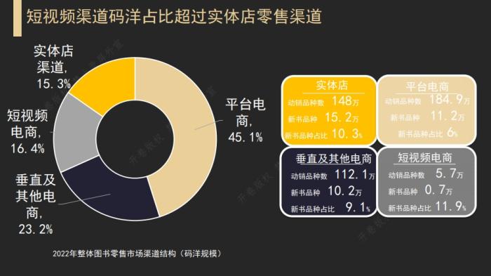 另外,2022年零(ling)售(shou)圖書市場(chang)中,短視(shi)(shi)頻電(dian)商碼洋占比趕超實體店渠道零(ling)售(shou)占比。目前(qian)短視(shi)(shi)頻電(dian)商作為新(xin)興電(dian)商,聚集(ji)越來越多的用(yong)戶注意(yi)力。