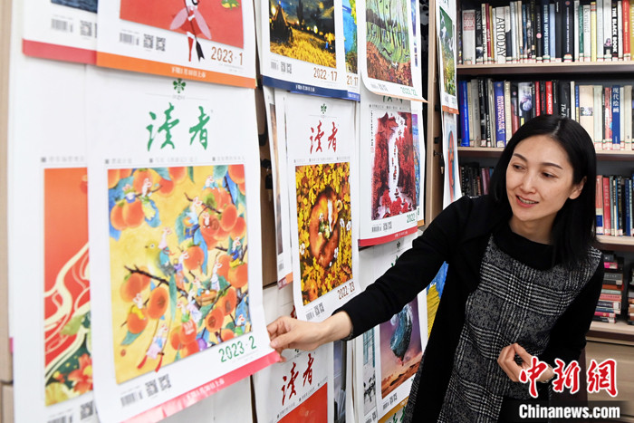 圖(tu)為2月20日(ri),陳天竺向中新(xin)社記(ji)(ji)者(zhe)(zhe)(zhe)介紹《讀者(zhe)(zhe)(zhe)》雜志往期(qi)封面。 中新(xin)社記(ji)(ji)者(zhe)(zhe)(zhe) 九(jiu)美旦(dan)增 攝