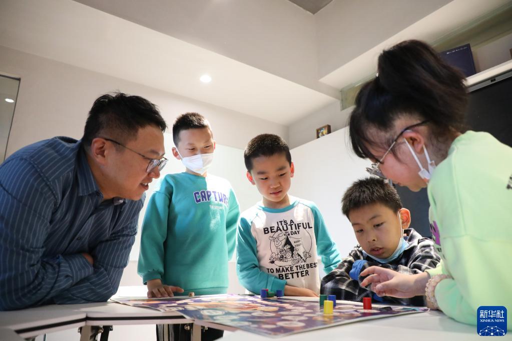 4月1日,在甘肅省蘭州市的讀(du)(du)者(zhe)出版(ban)集團(tuan)數字閱(yue)讀(du)(du)中心讀(du)(du)者(zhe)小(xiao)站,工作人員與(yu)小(xiao)朋友一起玩“講述中國(guo)神(shen)話故事”的飛行棋游戲。新(xin)華社記者(zhe) 馬希平 攝