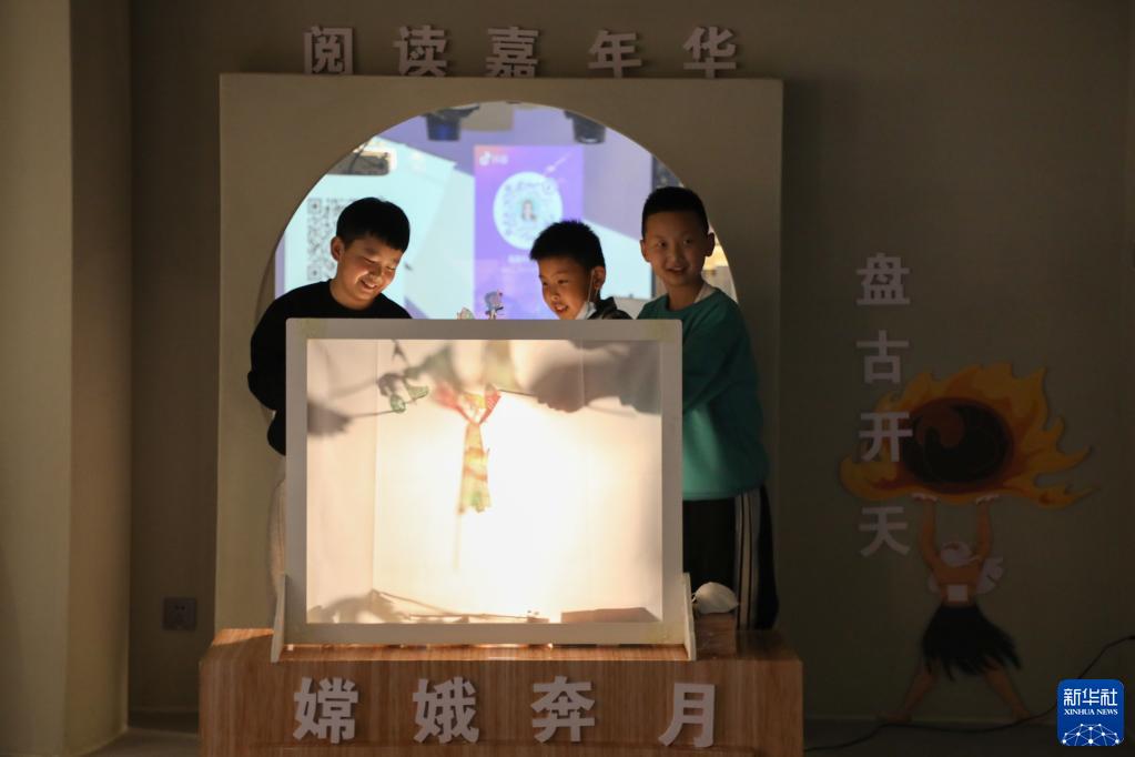 4月1日,在甘(gan)肅省蘭州市(shi)的讀者(zhe)出版集團(tuan)數字閱讀中心讀者(zhe)小站,小朋友體(ti)驗(yan)中國神話故(gu)事主題皮(pi)影戲。新華社記者(zhe) 馬希(xi)平 攝