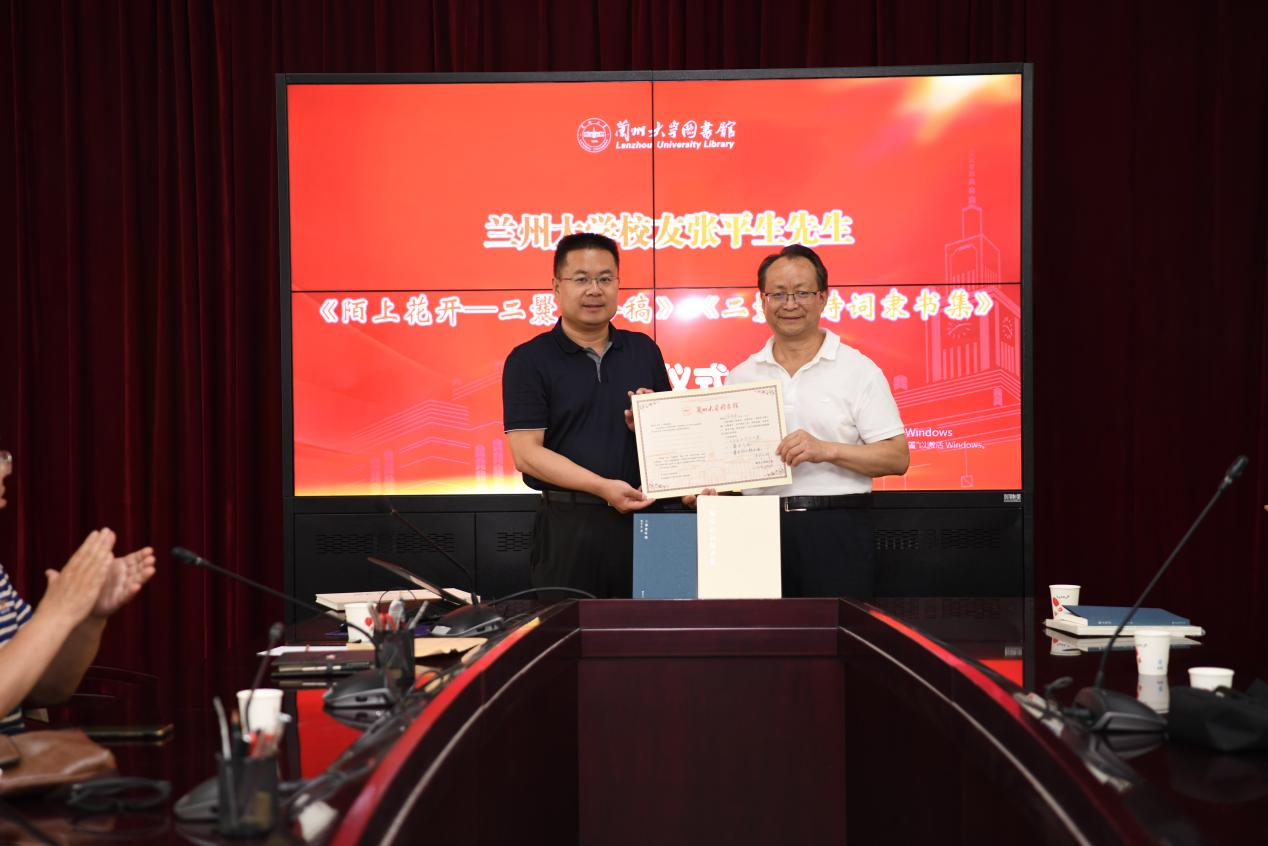 蘭州大(da)學(xue)圖書館及直屬單位黨委書記王偉國向張(zhang)平(ping)生頒發收藏(zang)證書