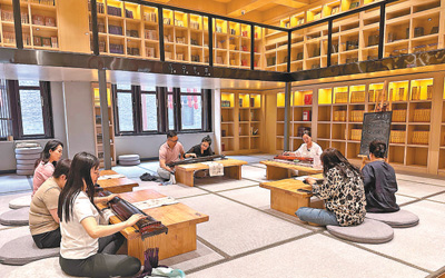 圖為(wei)讀者在沈(shen)陽老北(bei)市漢字主題書房學習彈奏古琴。記者 胡婧怡攝