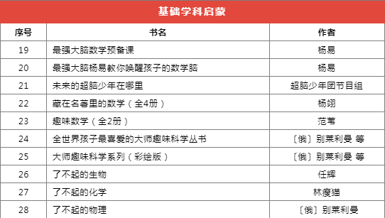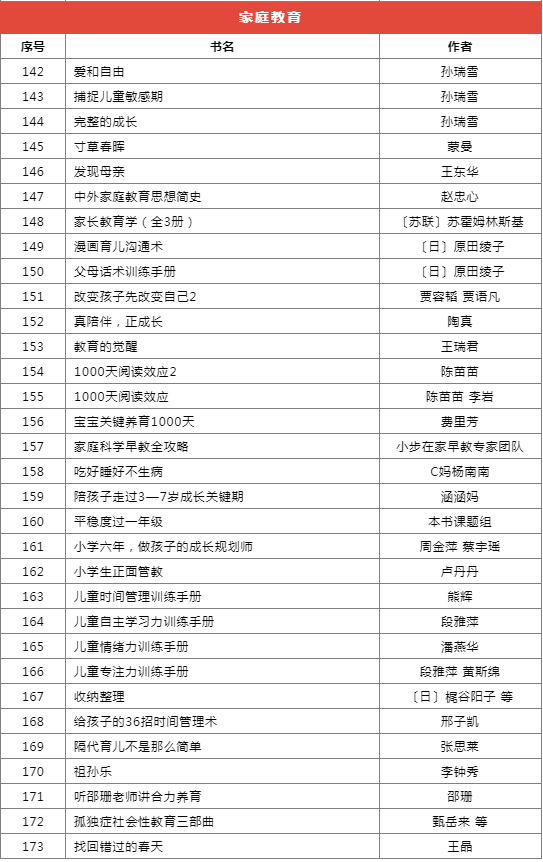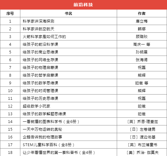 推薦書目種類(lei)繁多,分(fen)為前沿科技、基礎學(xue)(xue)科啟蒙、自然科學(xue)(xue)、家庭教育等十個類(lei)別,共計173本(ben)(套)。