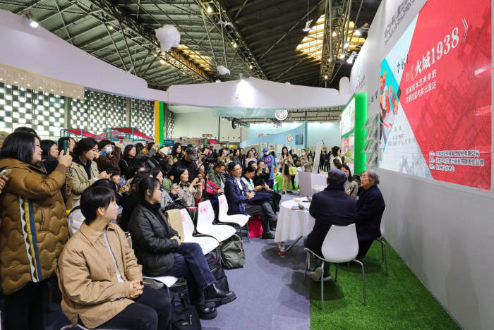11月17日,藝(yi)術家蔡皋(右一)在第十(shi)屆中國(guo)上海國(guo)際童書展(zhan)現場(chang)與(yu)書迷交流。