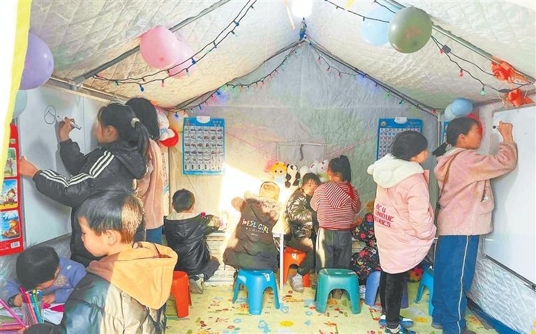 12月24日下午(wu),積石山縣大河(he)家鎮大河(he)村安置點上,傳來孩子們(men)瑯(lang)瑯(lang)讀(du)書聲。