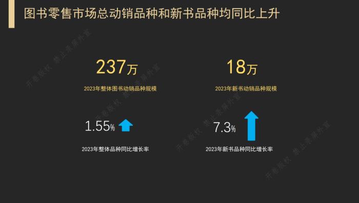 上述《報(bao)告》顯示(shi),2023年整體零售(shou)市場總動(dong)(dong)銷(xiao)品種(zhong)(zhong)達(da)237萬(wan)(wan)種(zhong)(zhong),同比上升(sheng)(sheng)1.55%,動(dong)(dong)銷(xiao)新書品種(zhong)(zhong)達(da)18萬(wan)(wan)種(zhong)(zhong),同比上升(sheng)(sheng)7.3%。