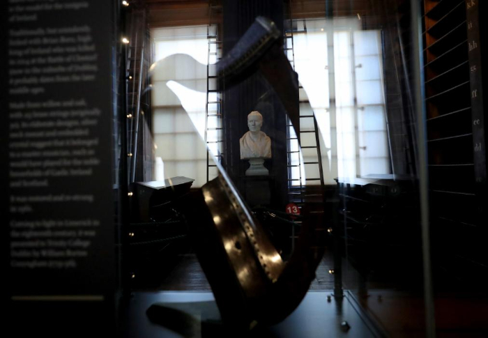這是在愛爾蘭(lan)都(dou)柏林大(da)學圣(sheng)三(san)一(yi)學院老圖書館(guan)拍(pai)攝的(de)豎琴和雕像(1月16日攝)。